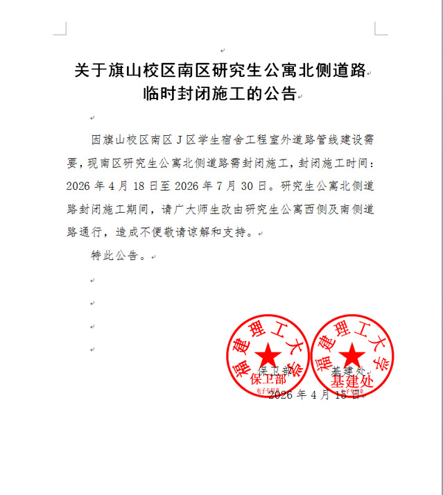 关于旗山校区南区研究生公寓北侧道路临时封闭施工的公告